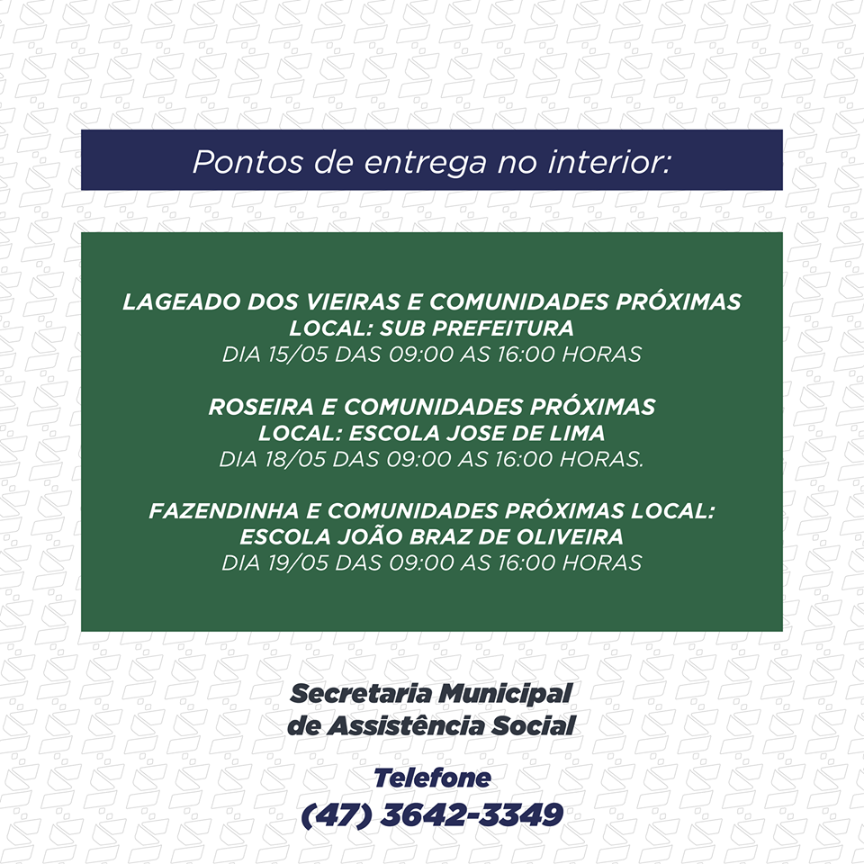Para evitar aglomerações neste período de combate a disseminação do coronavírus, a distribuição será feita em diversos locais do município e em pontos de entrega no interior, conforme cronograma na imagem.