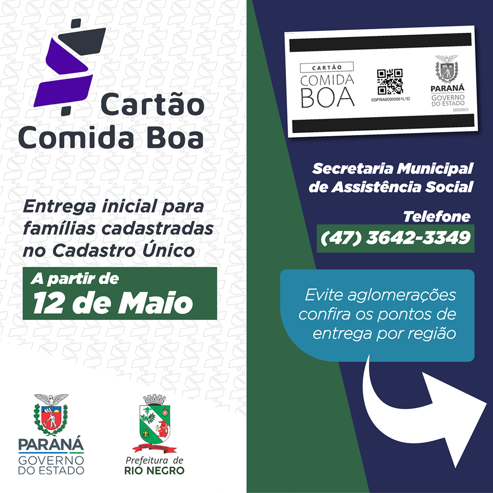A Prefeitura de Rio Negro, através da Secretaria Municipal de Assistência Social, inicia nesta terça-feira (12), a entrega do “Cartão Comida Boa” às famílias inscritas no Cadastro Único. A distribuição acontece das 8h30 às 16h30.