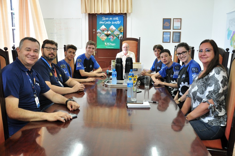 O prefeito James Karson Valério e a secretária de educação, Vera Pfeffer Schelbauer, receberam nesta segunda-feira a visita da equipe de robótica The Gears do Colégio Sesi de Rio Negro. Acompanhados do coordenador do colégio e dos técnicos, os alunos explanaram as conquistas recentes e as expectativas para as próximas competições da First Lego League (FLL).
