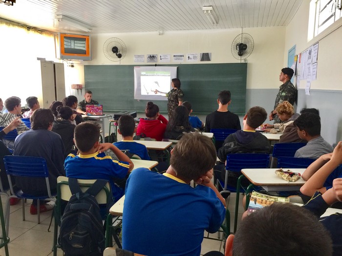 A palestra, ministrada para os alunos do 8º e 9º ano, contou com o apoio do 5º Regimento de Carros de Combate, tendo como palestrante a 3ª Sargento Romancini, a qual conscientizou os alunos sobre a importância de aprender para combater a doença.