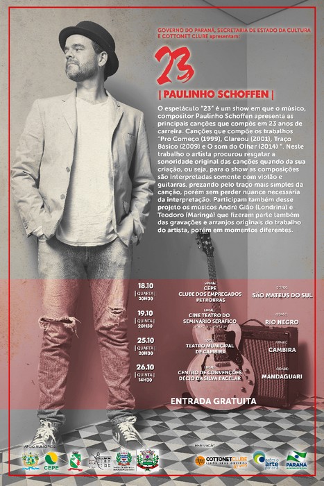 A população está convidada para prestigiar a apresentação do Espetáculo “23” de Paulinho Schoffen, que acontece no próximo dia 19 de outubro, às 20h30, no Cine Teatro Antonio Cândido do Amaral. A entrada é gratuita. O espetáculo foi contemplado pelo Prêmio Arte Paraná, da Secretaria de Estado da Cultura e vem a Rio Negro para animar os amantes da boa música.