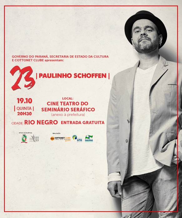 A população está convidada para prestigiar a apresentação do Espetáculo “23” de Paulinho Schoffen, que acontece no próximo dia 19 de outubro, às 20h30, no Cine Teatro Antonio Cândido do Amaral. A entrada é gratuita. O espetáculo foi contemplado pelo Prêmio Arte Paraná, da Secretaria de Estado da Cultura e vem a Rio Negro para animar os amantes da boa música.