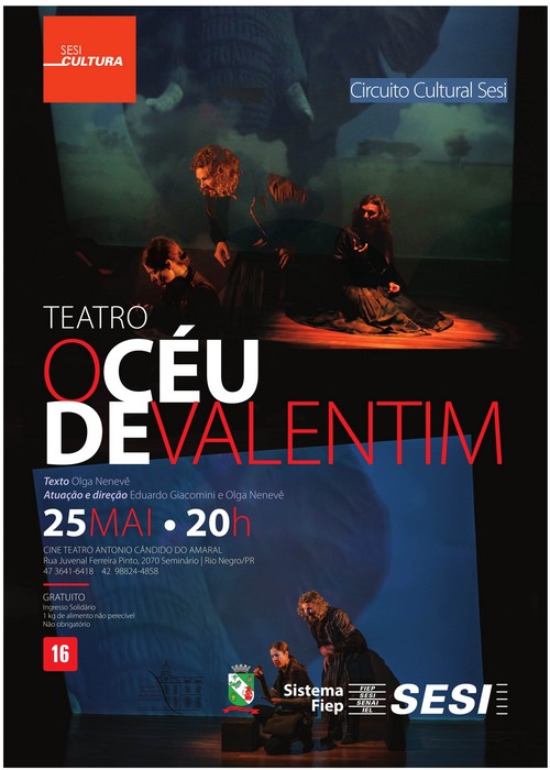 A Prefeitura Municipal de Rio Negro, através da Secretaria de Cultura e Turismo, em parceria com o Sesi Rio Negro, convida a todos para o espetáculo “O céu de Valentim”. O evento acontece nesta sexta-feira, 25 de maio, às 20h, no Cine Teatro Antônio Cândido do Amaral. A entrada é gratuita. Classificação indicativa: 16 anos.