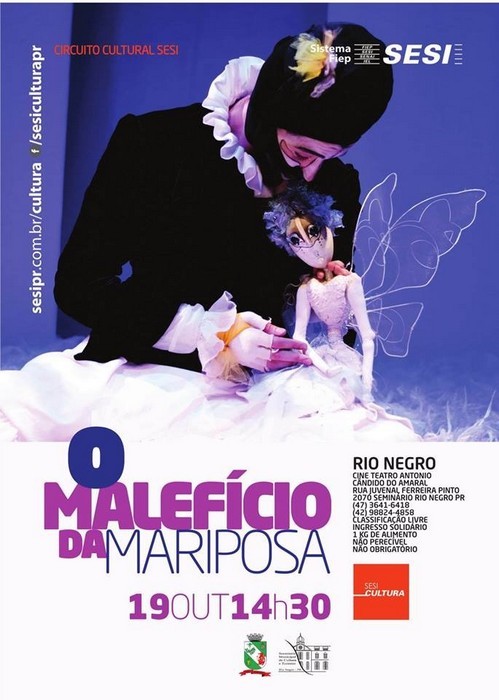 No próximo dia 19 de outubro, o município de Rio Negro, e o Sesi apresentam o espetáculo “O Malefício da Mariposa”. A apresentação acontece no Cine Teatro Antonio Cândido do Amaral, às 14h30min. Entrada franca. Classificação indicativa livre.