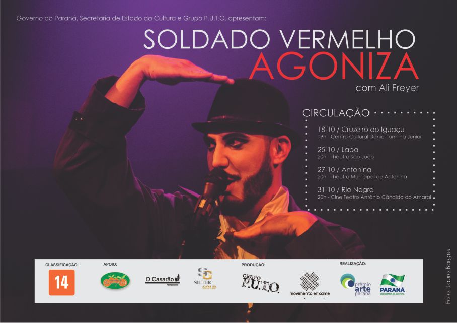 Rio Negro receberá no dia 31 de outubro o espetáculo teatral “Soldado Vermelho Agoniza”, às 20h, no Cine Teatro Antonio Cândido do Amaral. A entrada é gratuita.