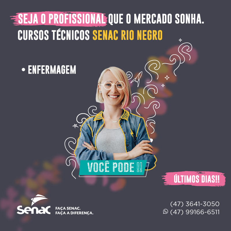 Estão abertas as inscrições para os cursos técnicos do SENAC Rio Negro. São os últimos dias! Aproveite e seja o profissional que o mercado sonha.