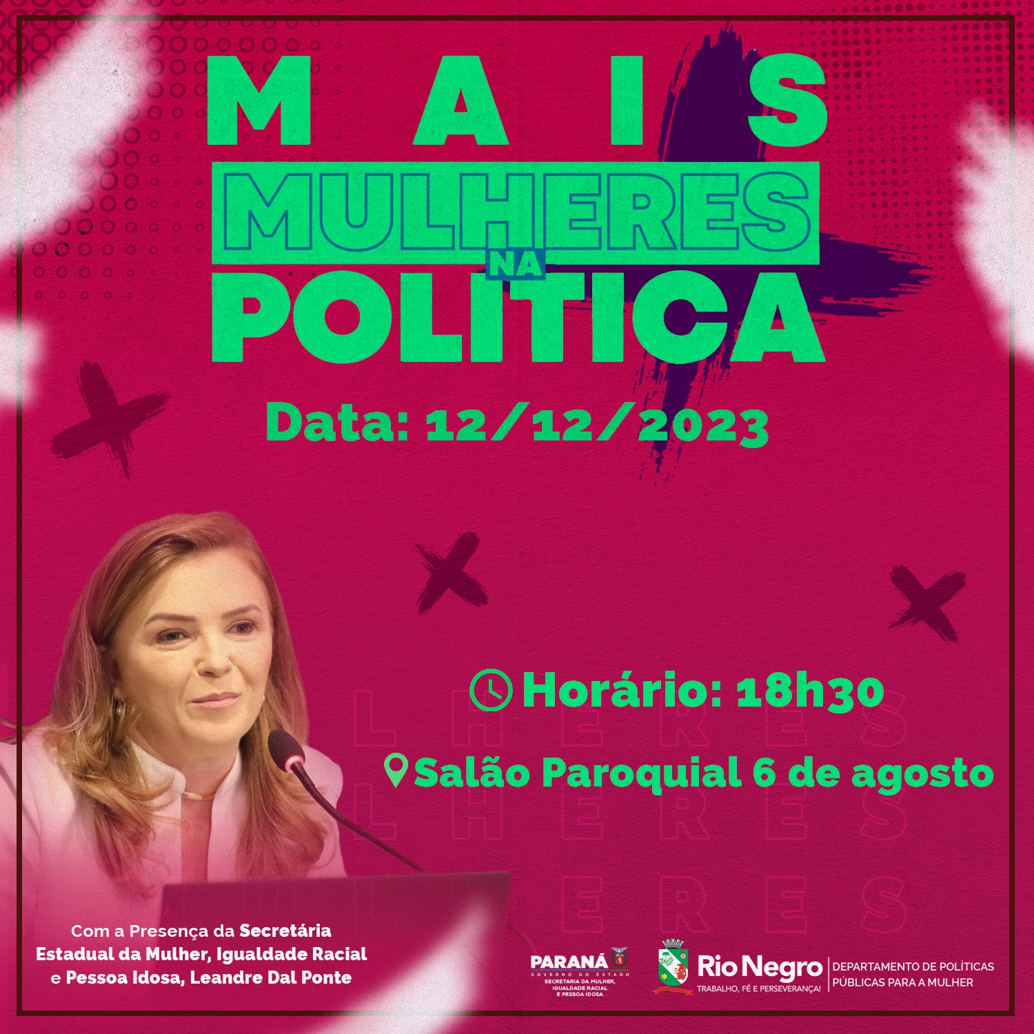 Dia 12 de dezembro, às 18h30 no Salão Paroquial 6 de Agosto, a secretária de Estado da Mulher, Igualdade Racial e Pessoa Idosa, Leandre Dal Ponte, estará em Rio Negro para uma conversa sobre a necessidade da participação feminina nas decisões políticas.
