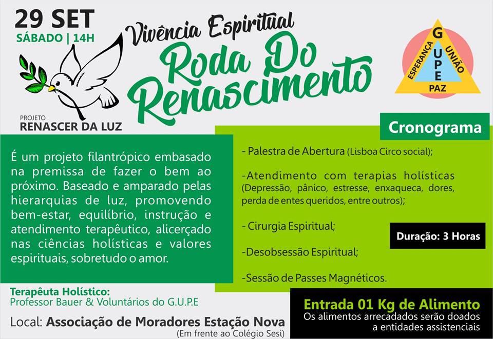 Ocorrerá no próximo sábado (29) na Associação de Moradores Estação Nova (em frente Colégio Sesi), em Rio Negro, a terceira edição do evento “Vivência Espiritual Roda do Renascimento”, a partir das 14h. Evento este que promete trazer grandes benfeitorias para todos os presentes, visando melhoras significativas no seu modo de viver a vida e de se reencontrar com seu eu interior, ministrado pelo terapeuta holístico Júnior Bauer e voluntários do G.U.P.E.