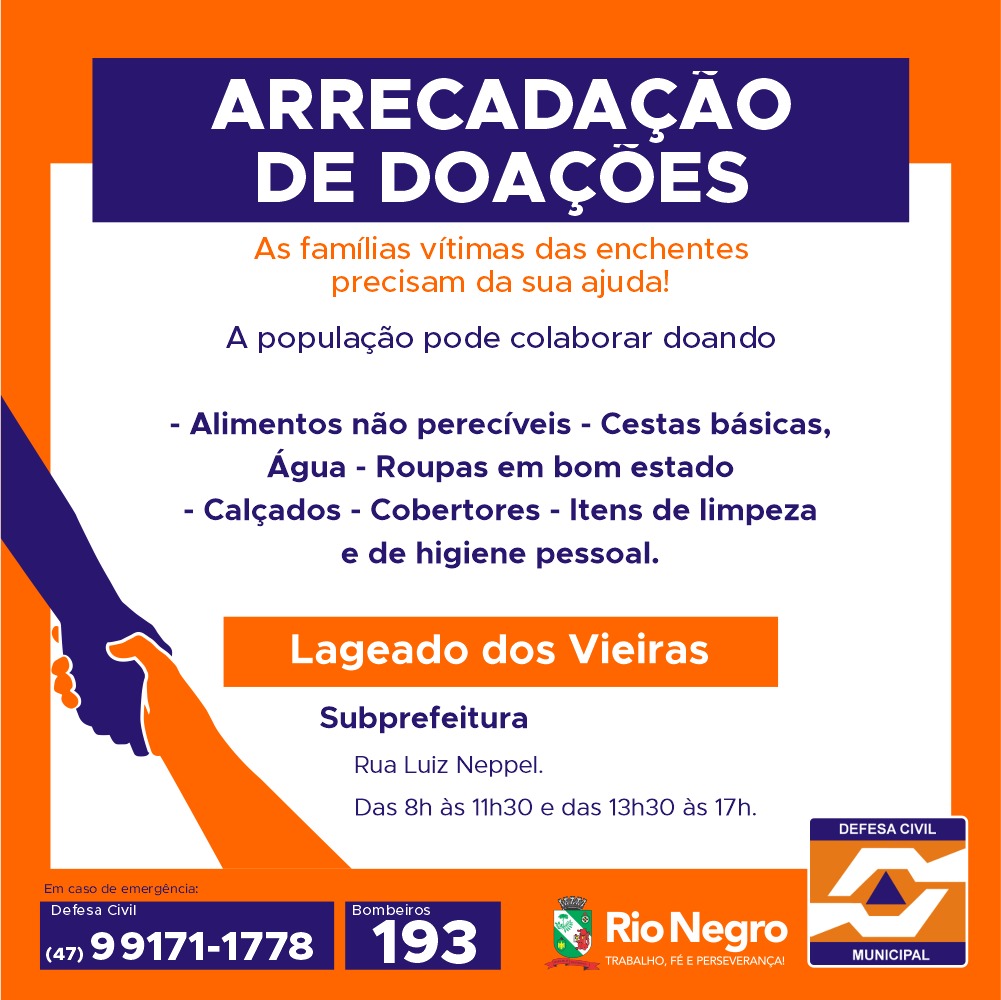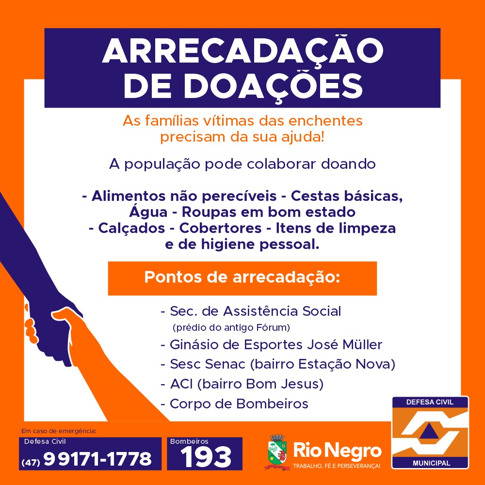 A população pode colaborar doando alimentos não perecÃveis, cestas básicas, água, roupas em bom estado de conservação, calçados, cobertores, itens de limpeza e de higiene pessoal. Confira os pontos de arrecadação em Rio Negro e colabore: