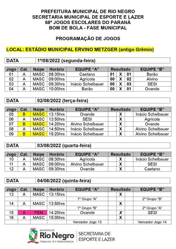 A fase municipal dos Jogos Escolares Bom de Bola teve inÃcio nesta segunda-feira (01) em Rio Negro com a primeira rodada. As demais rodadas serão realizadas durante esta semana conforme mostra a tabela.