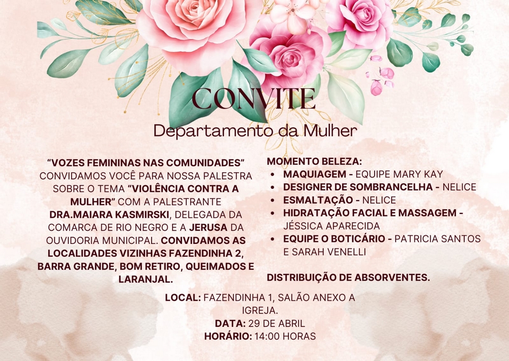 O Departamento de Políticas Públicas para Mulheres de Rio Negro realizará mais uma edição do projeto Vozes Femininas nas Comunidades. O evento será realizado na próxima terça-feira, dia 29, às 14h no salão da Igreja Nossa Senhora da Piedade, ao lado da escola da Fazendinha 1.