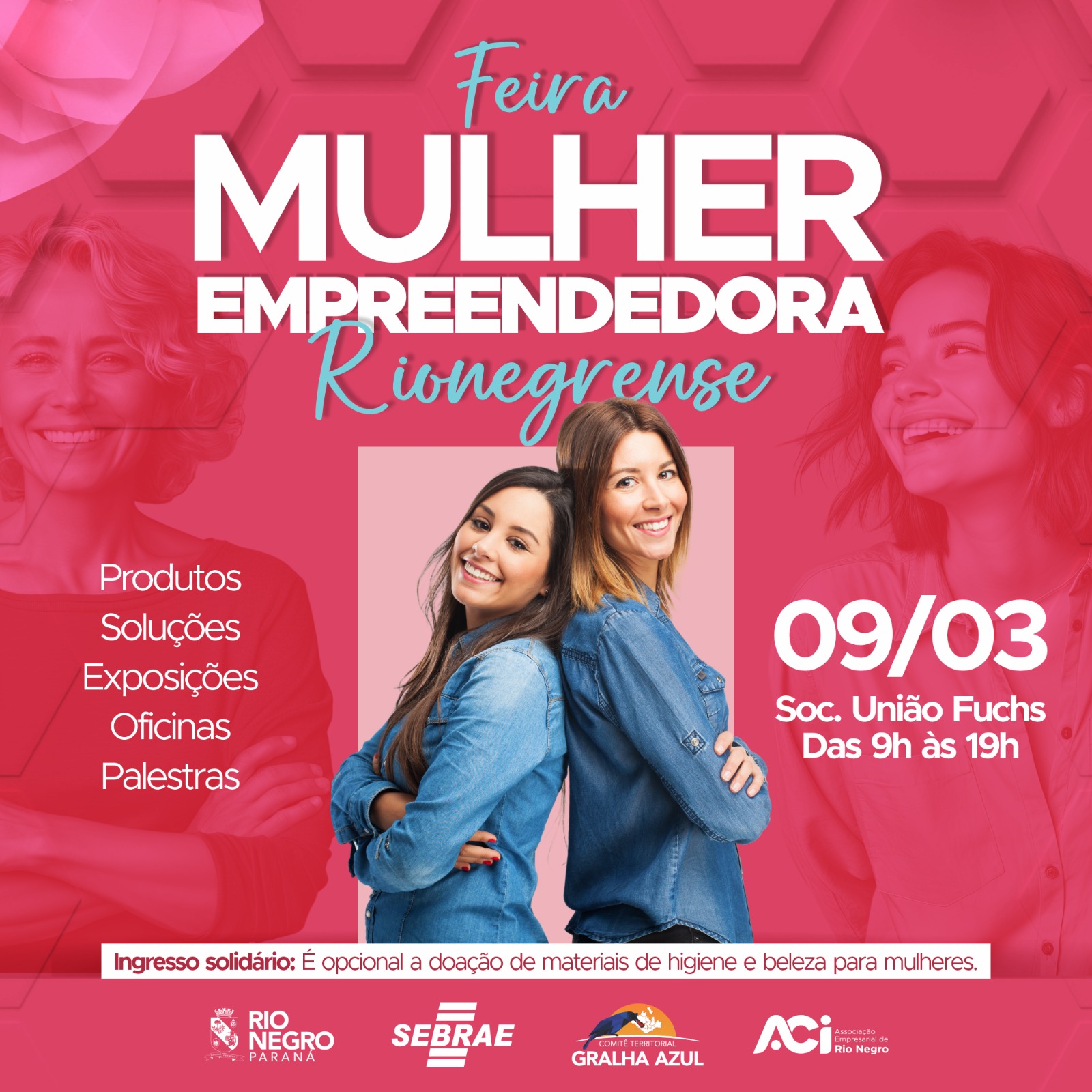 O evento ocorrerá no salão da Sociedade União Fuchs (Rua Ignácio Schelbauer, nº 55) das 9h às 19h com entrada gratuita, mas há a opção do ingresso solidário, sendo opcional a doação de materiais de higiene e beleza para mulheres.