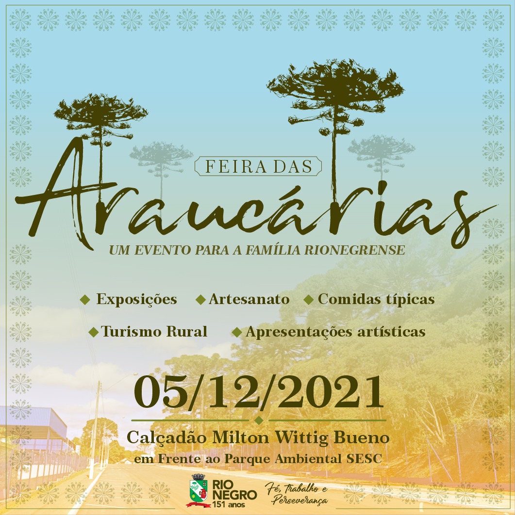 A Prefeitura Municipal de Rio Negro tem a honra de anunciar que em comemoração as festividades natalinas promove no dia 5 de dezembro (domingo) a Feira das Araucárias – Edição Natal.