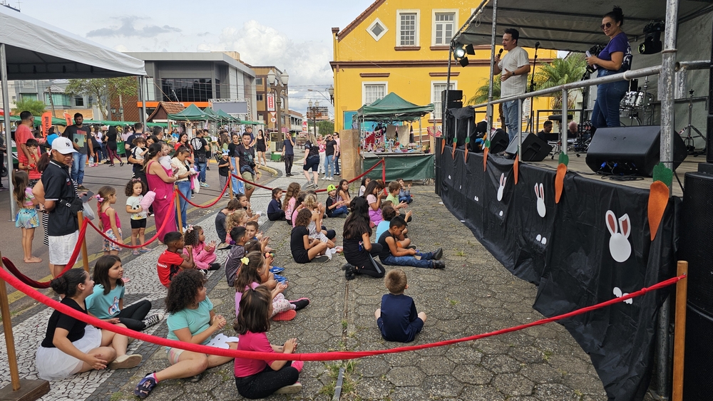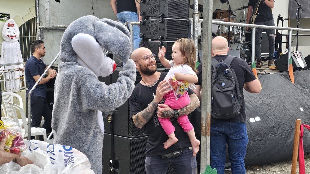 Após a abertura oficial feita por autoridades locais, houve a tão esperada chegada do Coelhinho da Páscoa, que ajudou na entrega de kits com doces e posou para diversas fotos, tornando o momento inesquecÃvel para muitas crianças.
