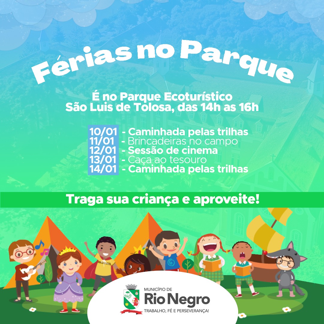 Para celebrar as férias de nossas crianças, a Prefeitura de Rio Negro promove na próxima semana, do dia 10 até 14 de janeiro, as Férias no Parque Ecoturístico São Luís de Tolosa.