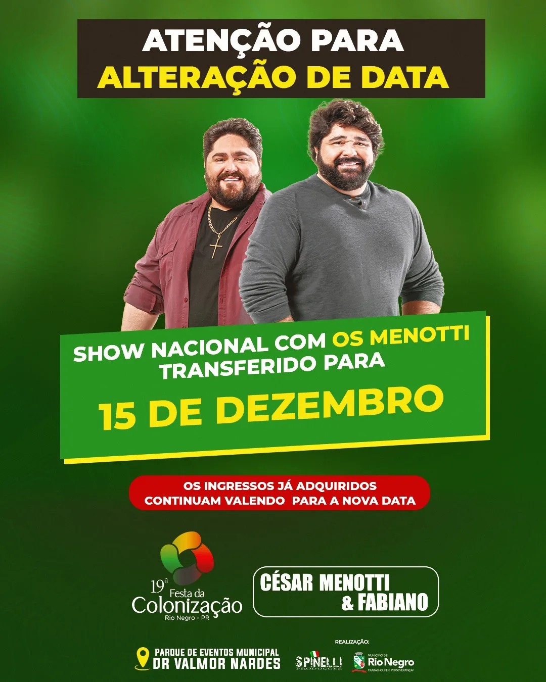 A 19ª Festa da Colonização tem nova data: 15, 16 e 17 de dezembro de 2023. O MunicÃpio de Rio Negro e a Spinelli Produções decidiram pelo adiamento da Festa devido à s condições climáticas apresentadas em nosso municÃpio e região nos últimos dias.