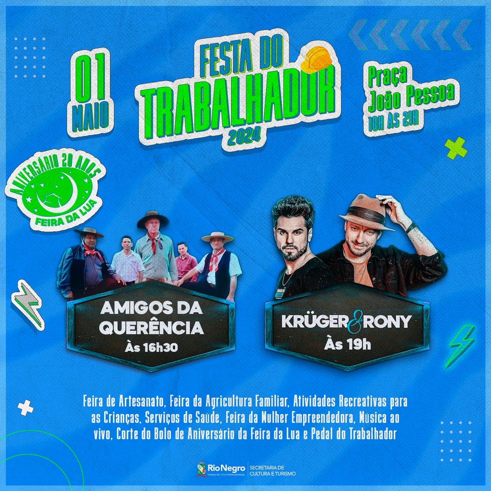 Dia 1º de maio acontece em Rio Negro a tradicional Festa do Trabalhador e Feira da Lua Especial de Aniversário, comemorando 20 anos. A programação é gratuita e acontece das 10h às 21h na Praça João Pessoa.