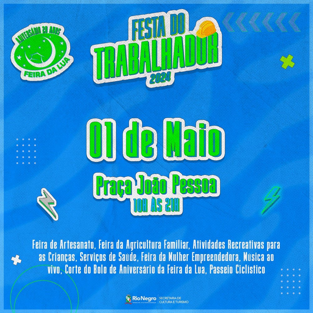 Dia 1º de maio acontece em Rio Negro a tradicional Festa do Trabalhador e Feira da Lua Especial de Aniversário, comemorando 20 anos. A programação é gratuita e acontece das 10h às 21h na Praça João Pessoa.