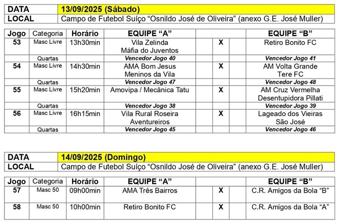 Toda a população está convidada para prestigiar a competição, torcer pelas equipes e valorizar o esporte em nosso município. Confira a programação completa dos jogos na tabela.