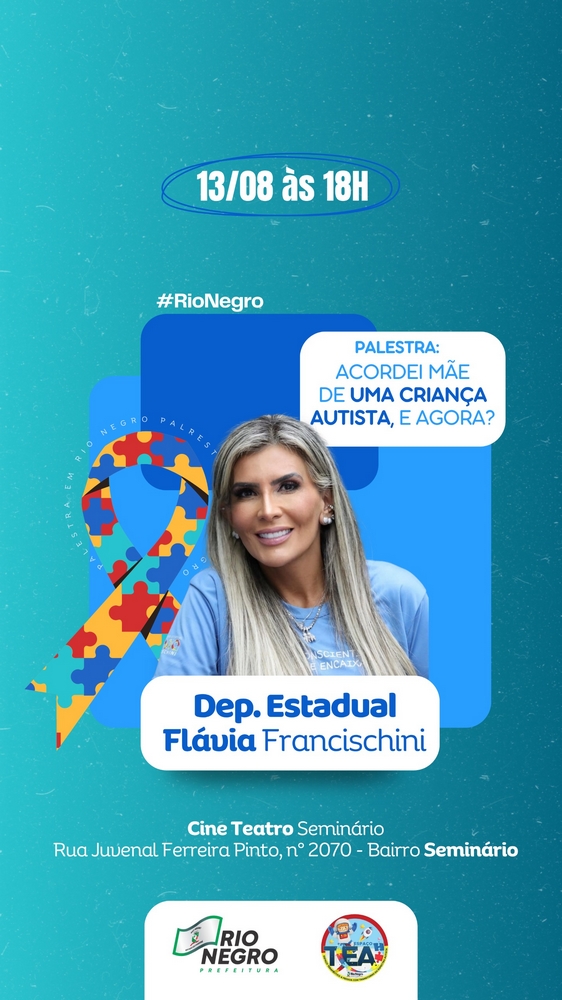 A palestra será ministrada pela deputada estadual Flávia Francischini, que estará em Rio Negro não como parlamentar, mas como mãe de criança autista, seu segundo filho, Bernardo. Em um evento dinâmico a deputada passará ao publico a sua experiência no dia a dia com o autismo.