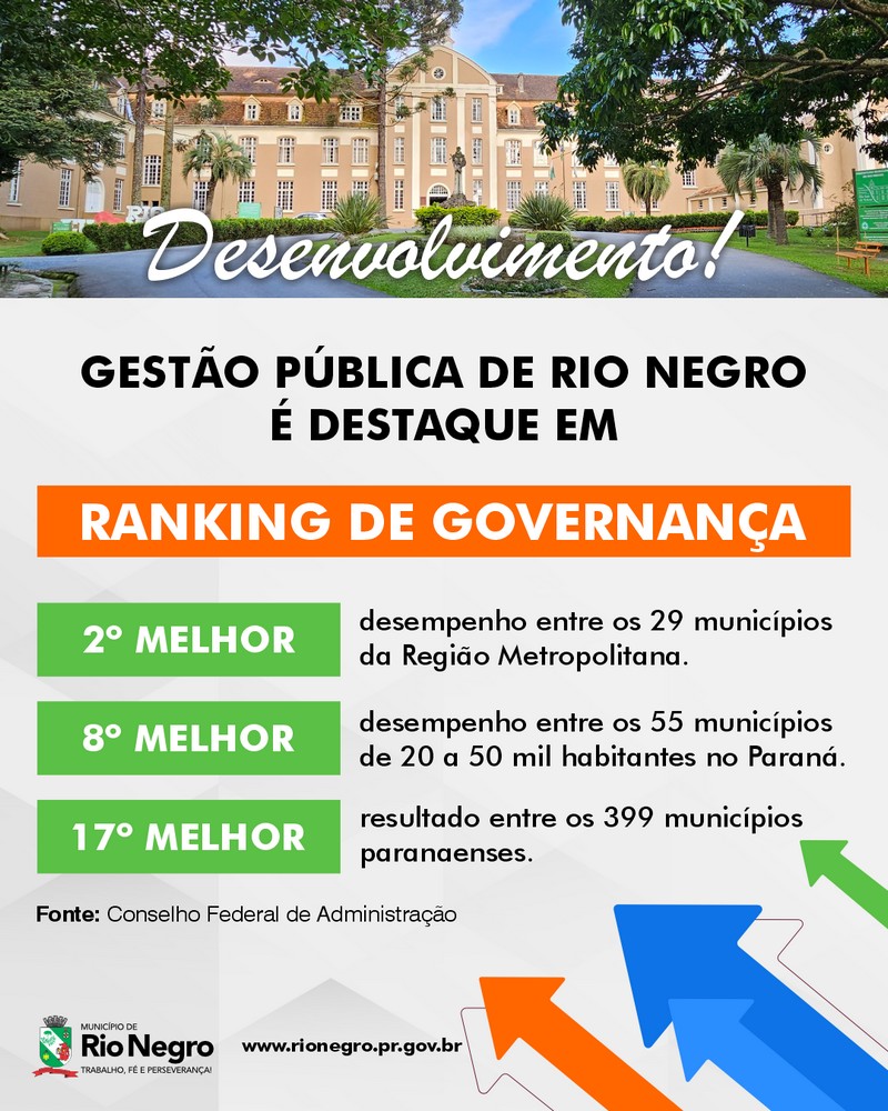 Novamente o município de Rio Negro obteve excelentes resultados no Ranking de Governança Municipal referente ao ano de 2023. Os dados foram divulgados recentemente e podem ser conferidos no site: www.igm.cfa.org.br