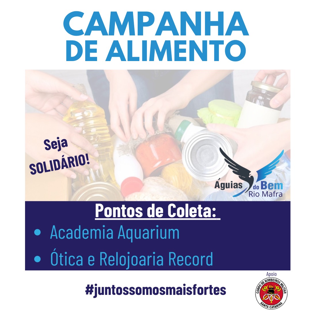 Os pontos de coleta são: Academia Aquarium e Relojoaria e Ótica Record. O grupo Águias do Bem Riomafra é formado por pessoas de Mafra e Rio Negro com o objetivo de fazer o bem sem olhar a quem.