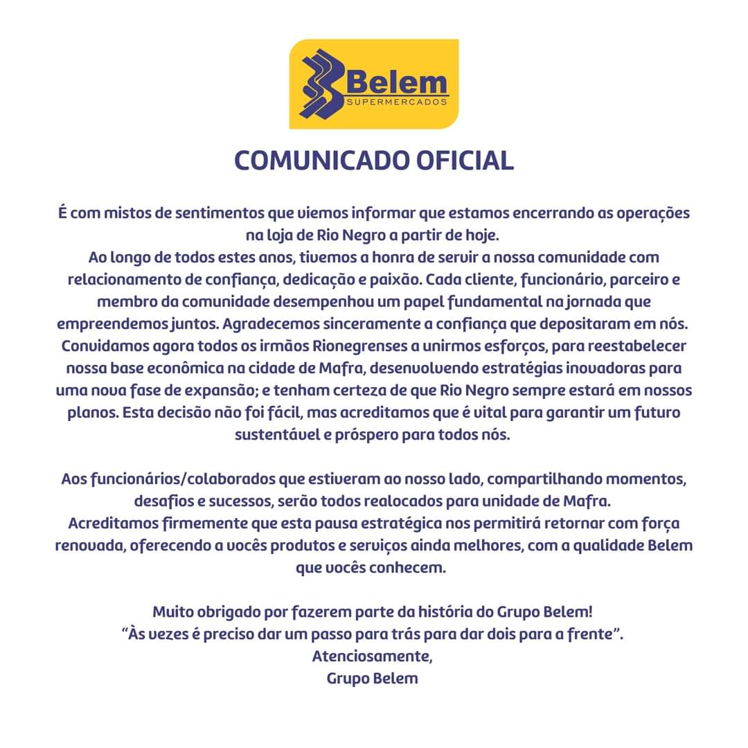 O Grupo Belém comunicou o fechamento da unidade de Rio Negro. O anúncio foi feito nas redes sociais. Leia na íntegra: