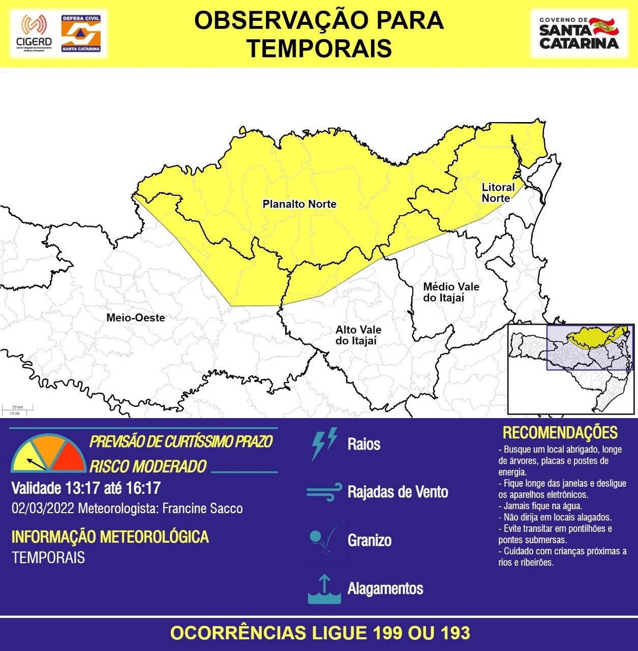 Há alerta para risco de temporal em Riomafra nesta quarta-feira