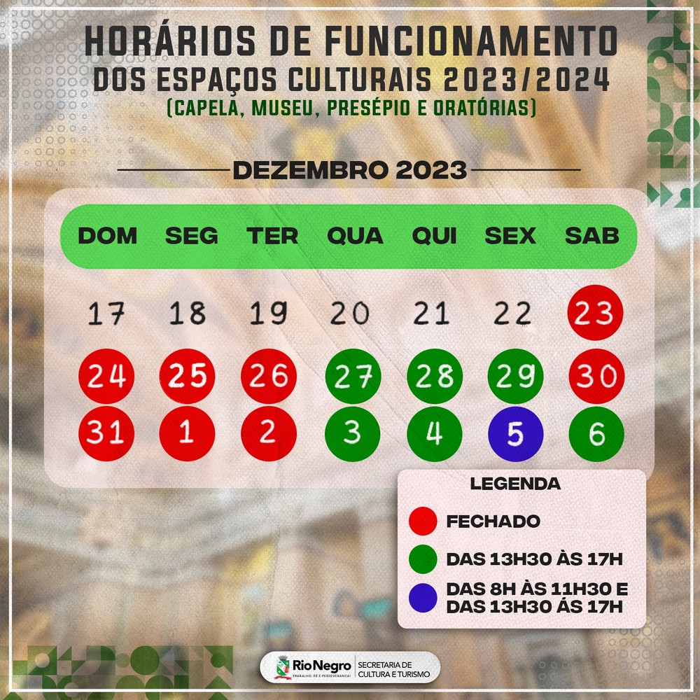 Confira nas imagens os horários de funcionamento do Parque Ecoturístico Municipal São Luís de Tolosa (campo, trilhas e jardins) e dos espaços culturais (capela, museu, presépio e oratórias).