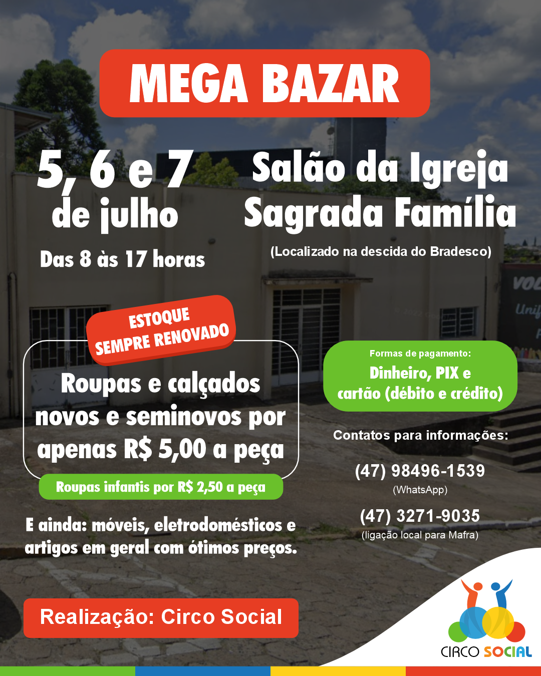Está programado para os próximos dias 05, 06 e 07 de julho, das 8h às 17h, o Mega Bazar Beneficente do Circo Social, a ser realizado no salão da Igreja Sagrada Família, situado na descida do Bradesco em Mafra.