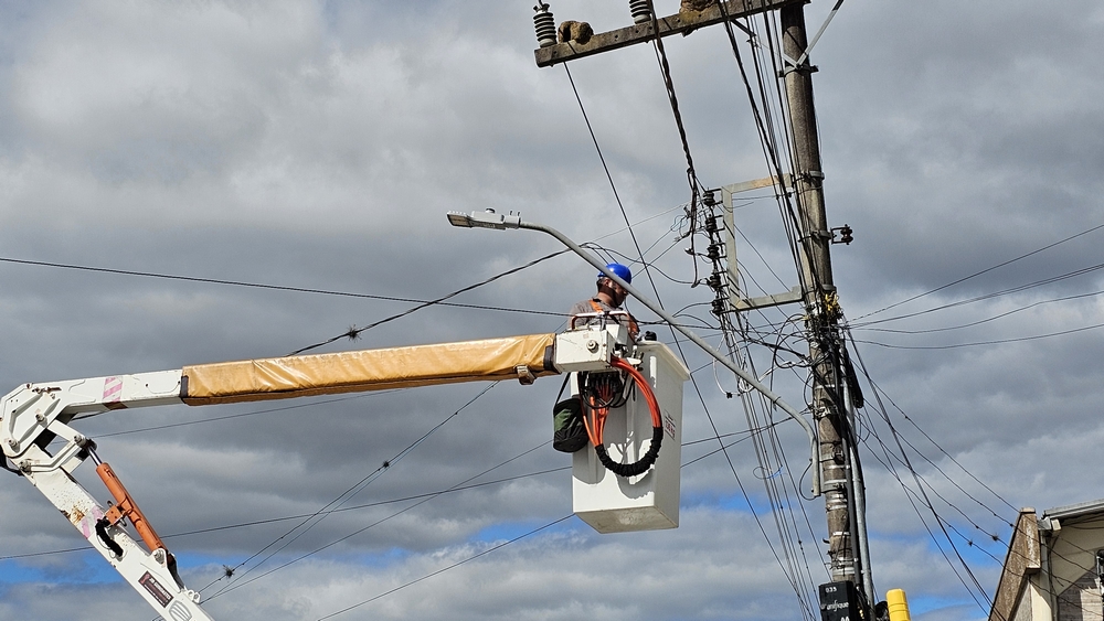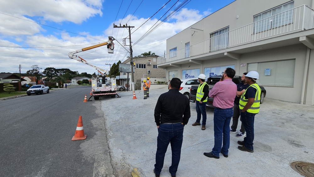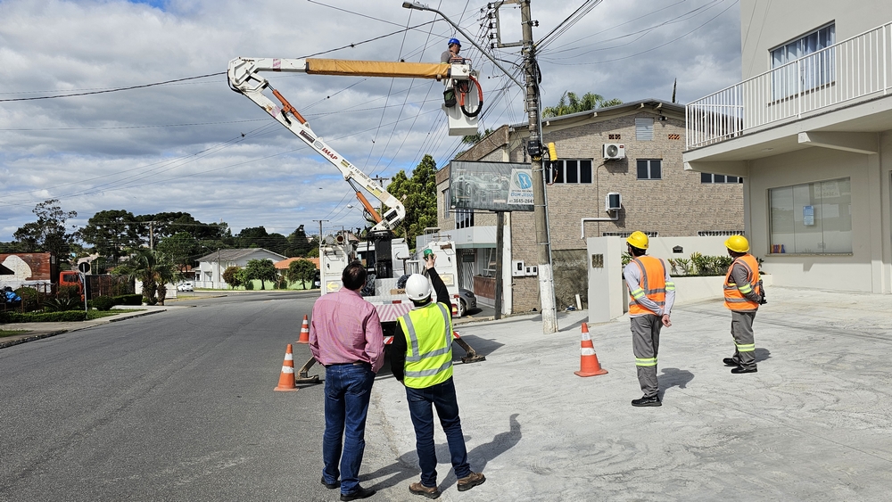 O prefeito Alessandro Cristian von Linsingen, juntamente com o engenheiro da Prefeitura, Vinicius Schmidt, esteve no local para acompanhar a instalação da primeira lâmpada LED na Rua Severo de Almeida.