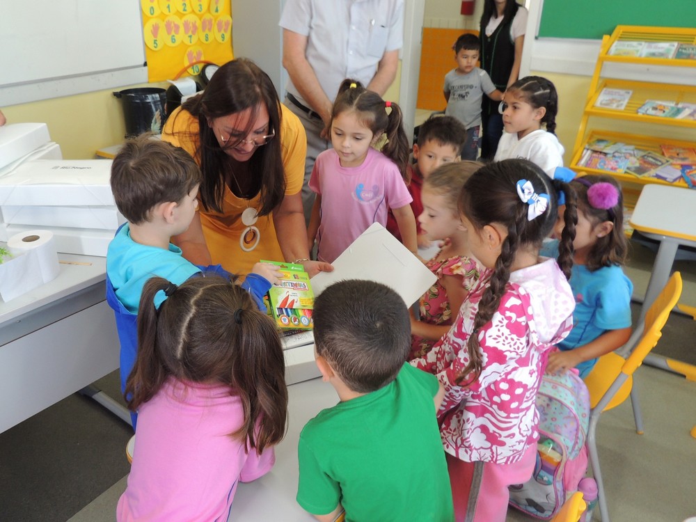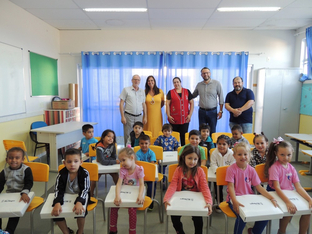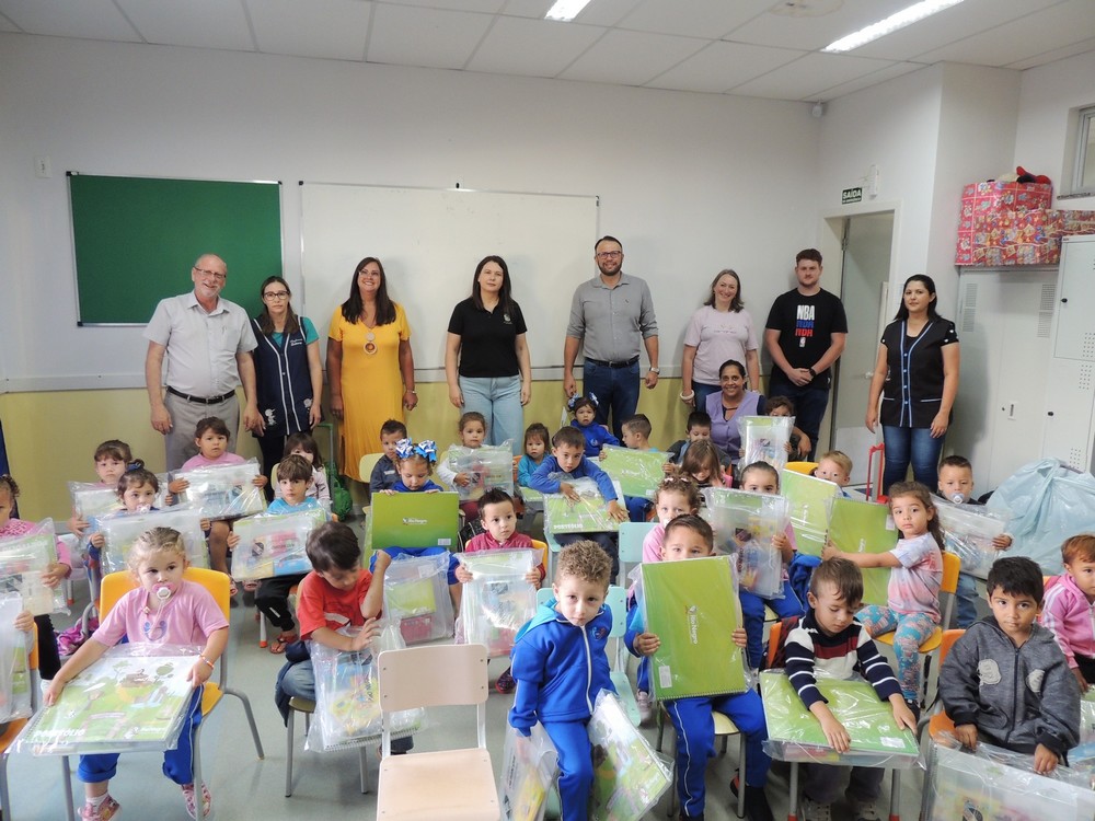 A equipe compareceu também na mesma manhã ao CMEI Agostinho Paizani Filho, visitando as crianças da educação infantil e realizando a entrega dos kits escolares, com enfoque para a novidade do portfólio.