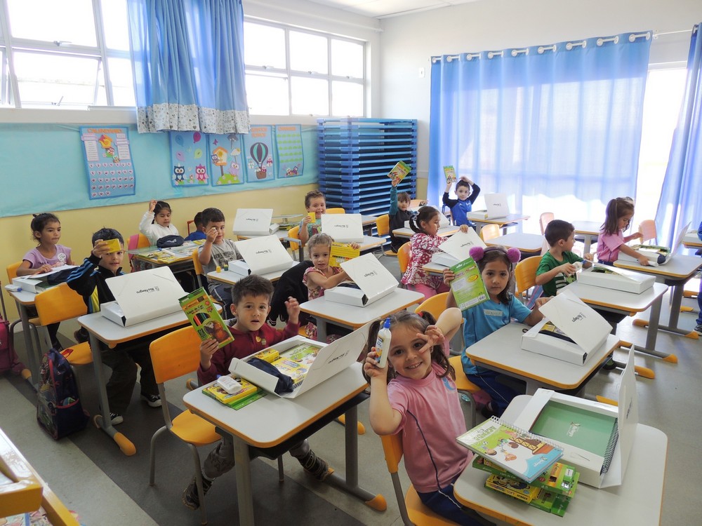 Após, foram realizadas as entregas dos kits escolares para alunos e professores, os quais vão trazer maior qualidade para a aprendizagem de todos, além de flexibilidade para os pais e responsáveis.