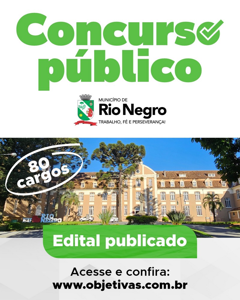 No último dia 13 foi lançado o edital do Concurso Público nº 01/2024 do MunicÃpio de Rio Negro. Há 80 cargos previstos para o nÃvel fundamental, médio, técnico e superior.