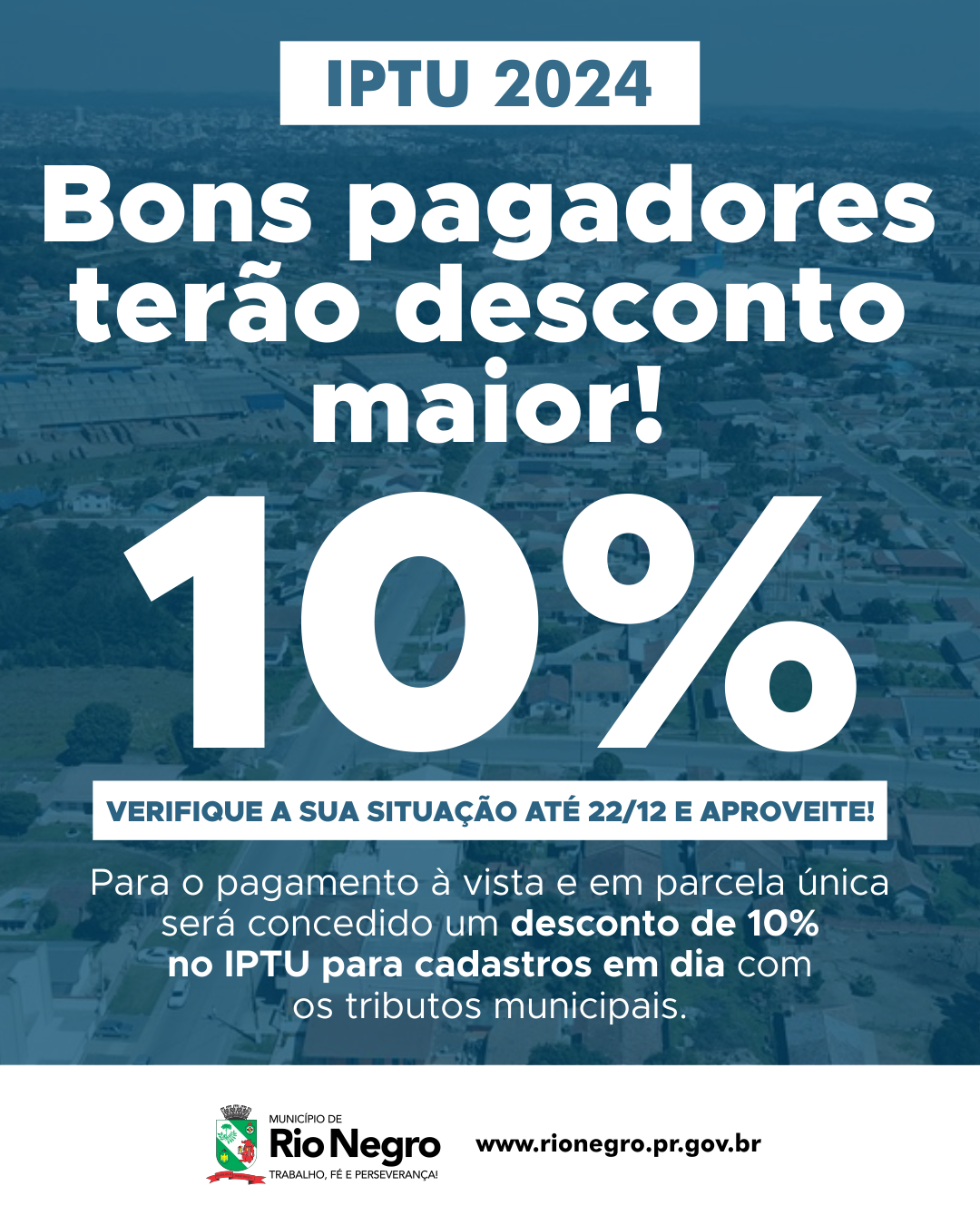 Para o IPTU de 2024, a Prefeitura de Rio Negro desenvolveu um plano de incentivos com descontos maiores para pessoas físicas e jurídicas que estão em dia com o fisco municipal e que optarem pelo pagamento à vista (cota única) do imposto. É o conceito do “bom pagador”, com desconto para quem cumpre suas obrigações.