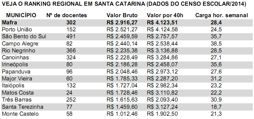 Na região do planalto norte catarinense, apenas Irineópolis, Major Vieira, Três Barras e Monte Castelo não pagam acima da média nacional. Dos demais, no ranking regional. Mafra e Porto União, são os município que melhor remuneram seus professores com 40 horas semanais. Monte Castelo é o município com a pior remuneração.