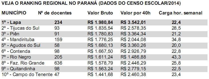 Já na nossa região Paraná, o vizinho município da Lapa é a que melhor remunera os seus professores, tanto no salário bruto como nas 40 horas/aula. Já Rio Negro, das 10 cidades da região pesquisadas, é a que menos paga seus professores por hora/aula, apenas R$ 1.486,88. No valor bruto, Rio Negro ficou apenas na 7ª colocação, perdendo para municípios mais pequenos, como: Piên, Agudos do Sul e Contenda por exemplo. (Veja no segundo quadro abaixo)