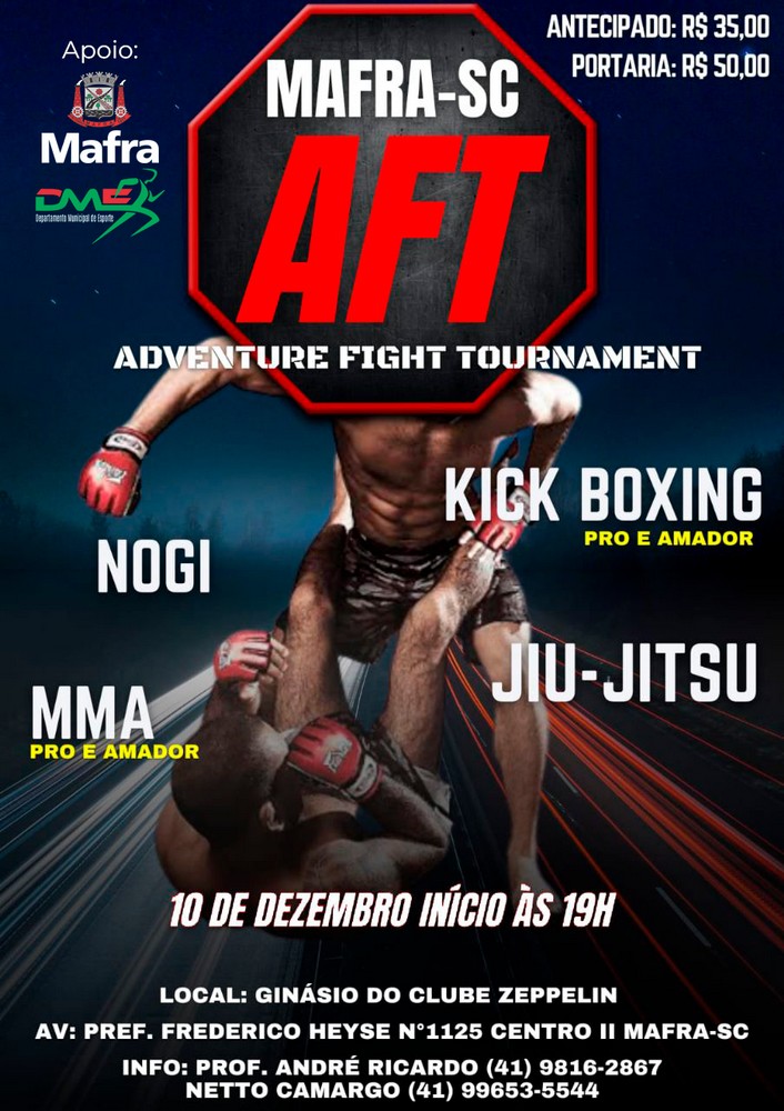 Pela segunda vez neste ano Mafra vai ser palco de evento de MMA. A II edição AFT Mafra de MMA e Artes Marciais Mistas acontecerá no dia 10 de dezembro, às 19 horas, no Clube Zeppelin. Para tratar do evento, que terá apoio do Departamento Municipal de Esportes, os promotores Neto Camargo e Ederson Portella estiveram em Mafra nesta quarta-feira, quando anunciaram algumas atrações.