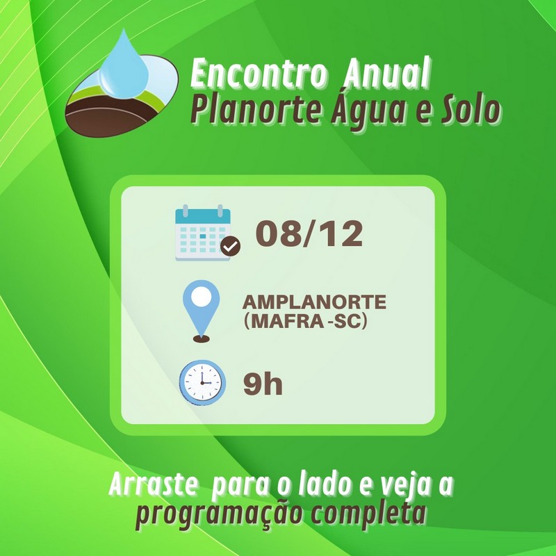 O município de Mafra sediará no dia 8 de dezembro, o encontro anual do Programa Uso Racional de Água e Solo do Planalto Norte Catarinense (Planorte Água e Solo), reunindo representantes de todos os municípios da região. Acontecerá na sede da Amplanorte, a partir das 9 horas. O evento abordará temáticas relevantes para a região, como a conservação do solo, sustentabilidade e gestão de recursos hídricos.