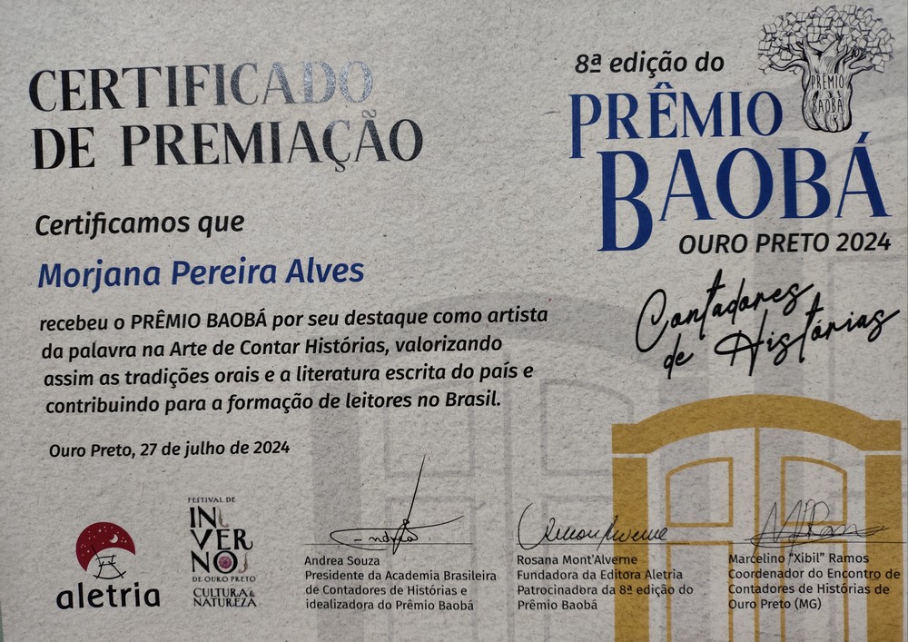 No último sábado (27), foi realizada em Ouro Preto-MG a oitava edição do Prêmio Baobá, que é a maior premiação nacional para contadores de histórias. O prêmio é considerado o “Oscar” dos contadores de histórias. Entre os premiados está a mafrense Morjana Pereira Alves, que contou duas histórias infantis no evento: Gargarria de Cris Rochavetz e Obax de André Neves.