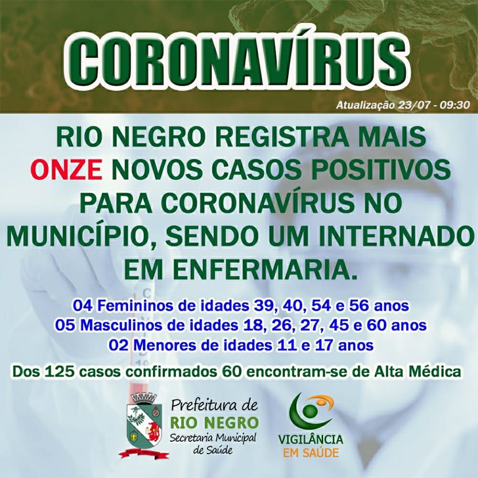 Nesta quinta-feira (23) mais 11 casos de coronavírus foram confirmados em Rio Negro. Agora são 125 casos positivos confirmados, sendo que 60 pessoas estão recuperadas.