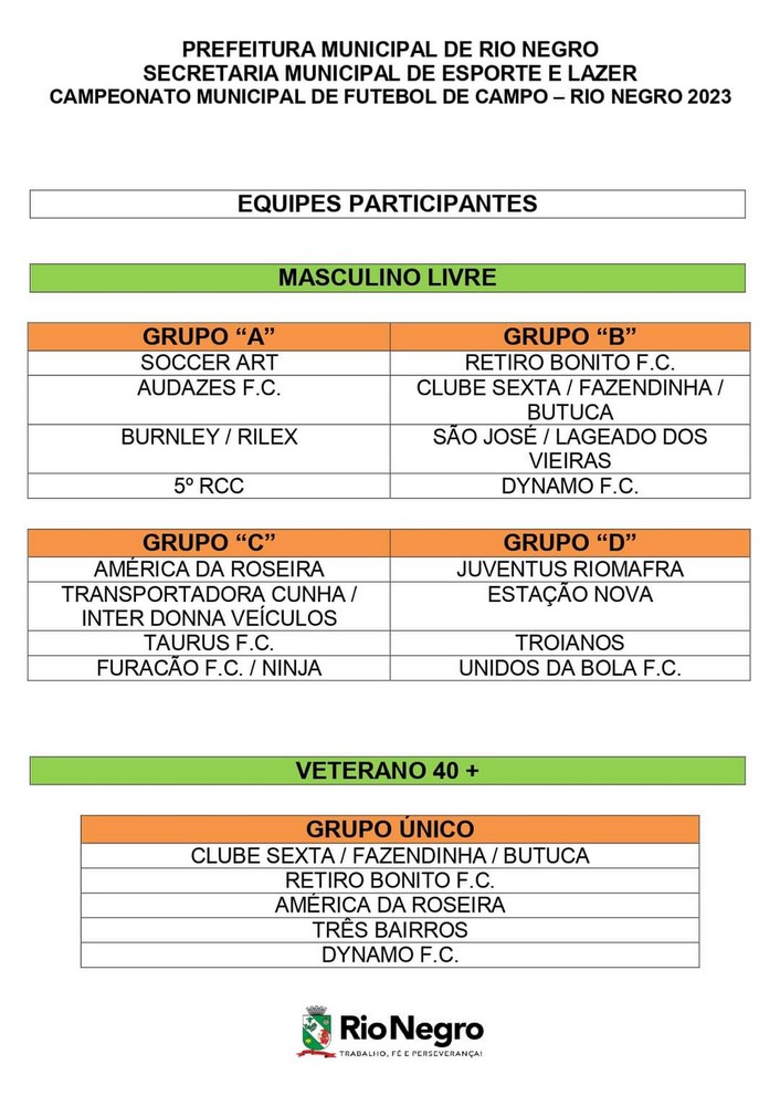 Em uma promoção da Prefeitura de Rio Negro, através da Secretaria Municipal de Esporte e Lazer, a edição 2023 do tradicional Campeonato Municipal de Futebol de Campo contará com a participação de 21 equipes, divididas em duas categorias.