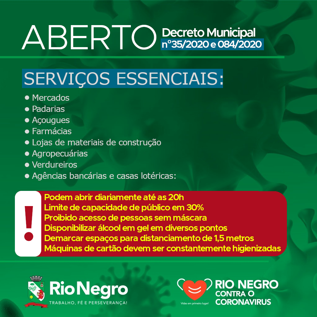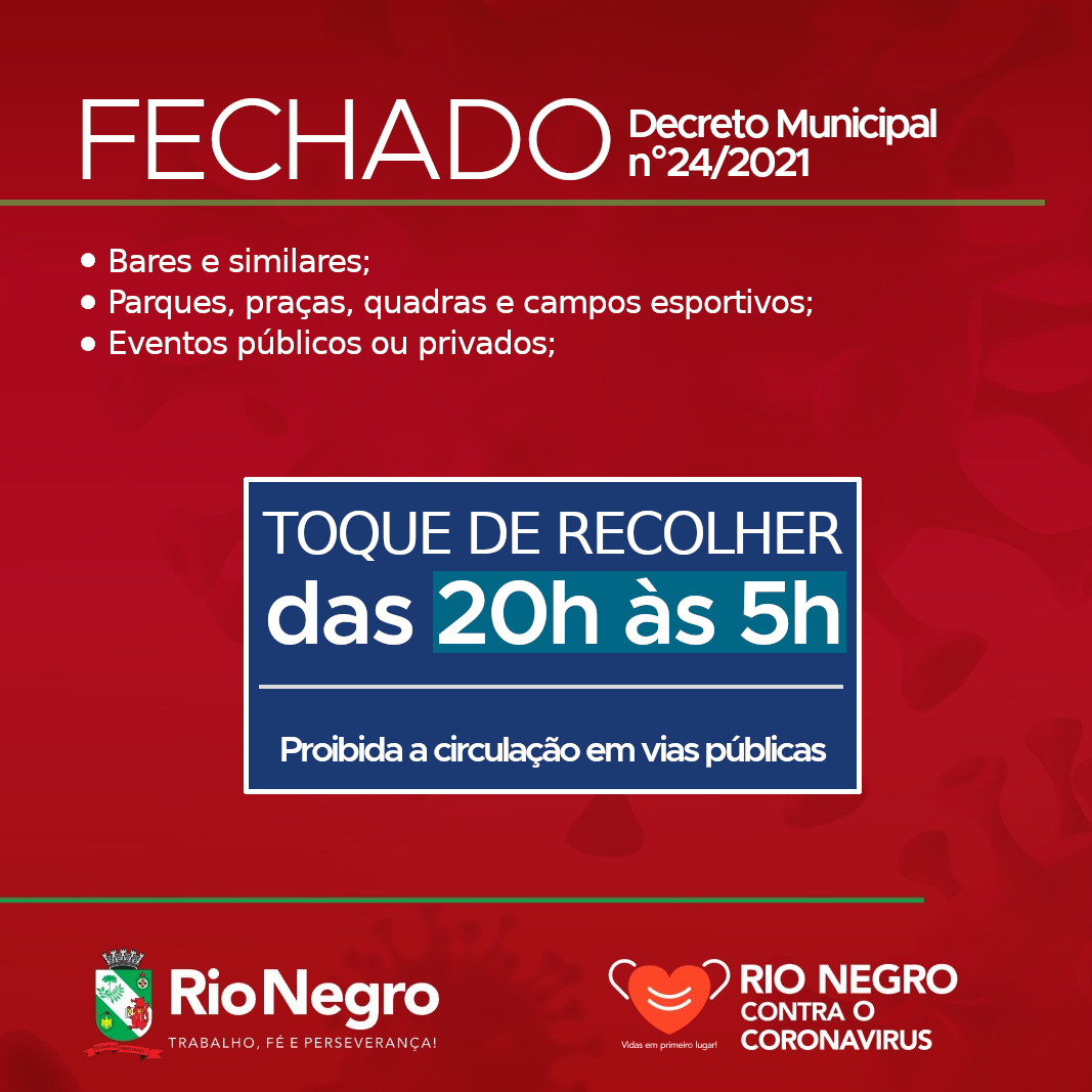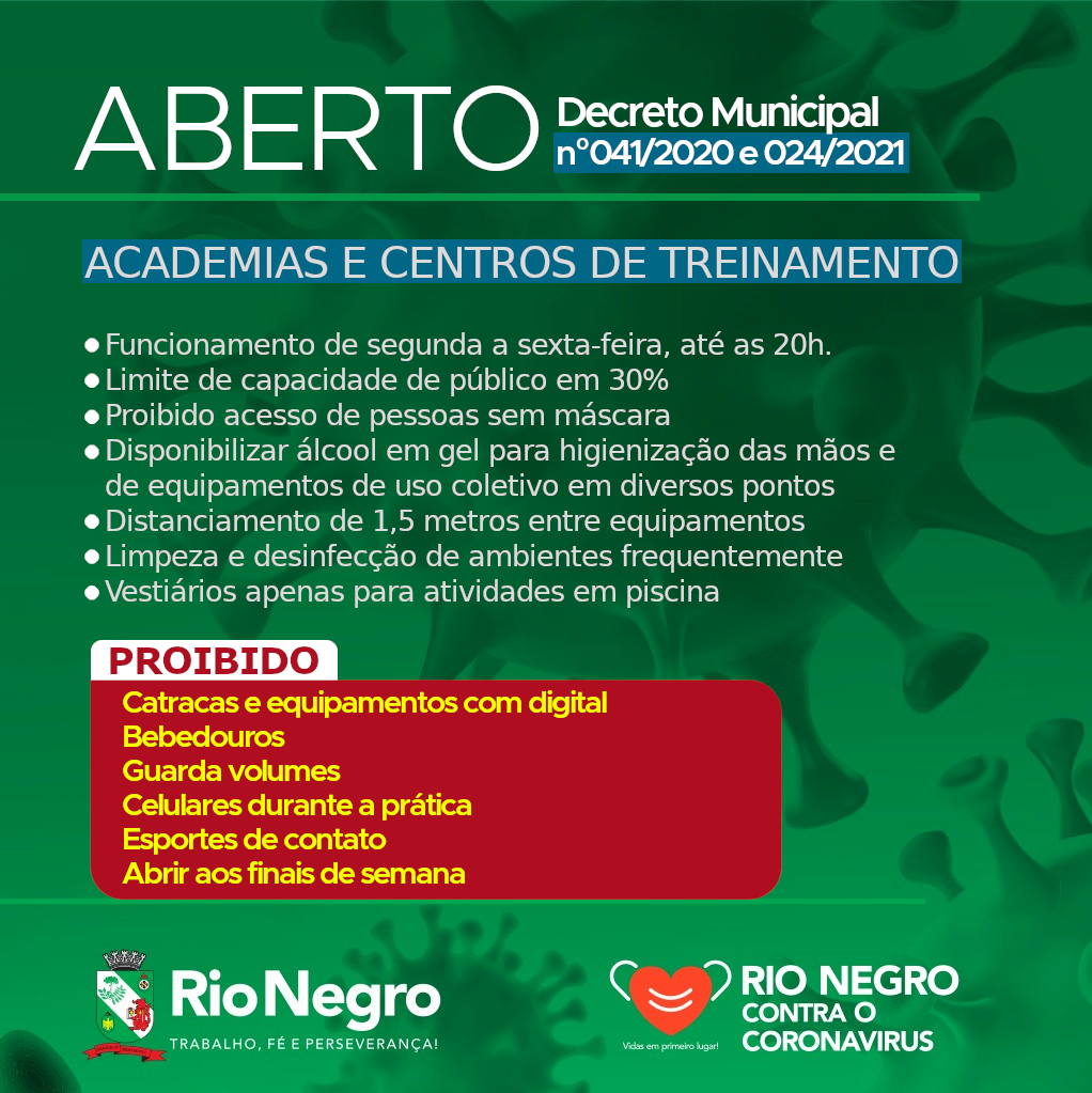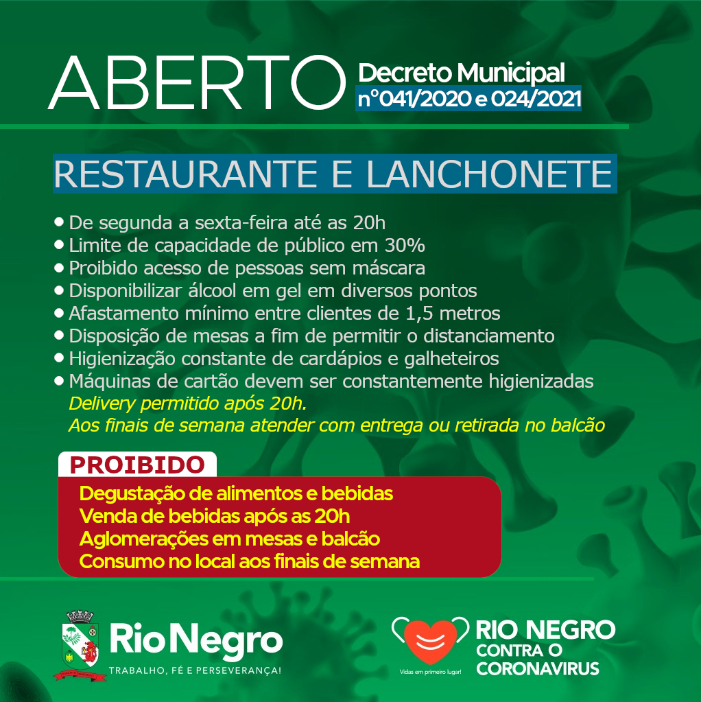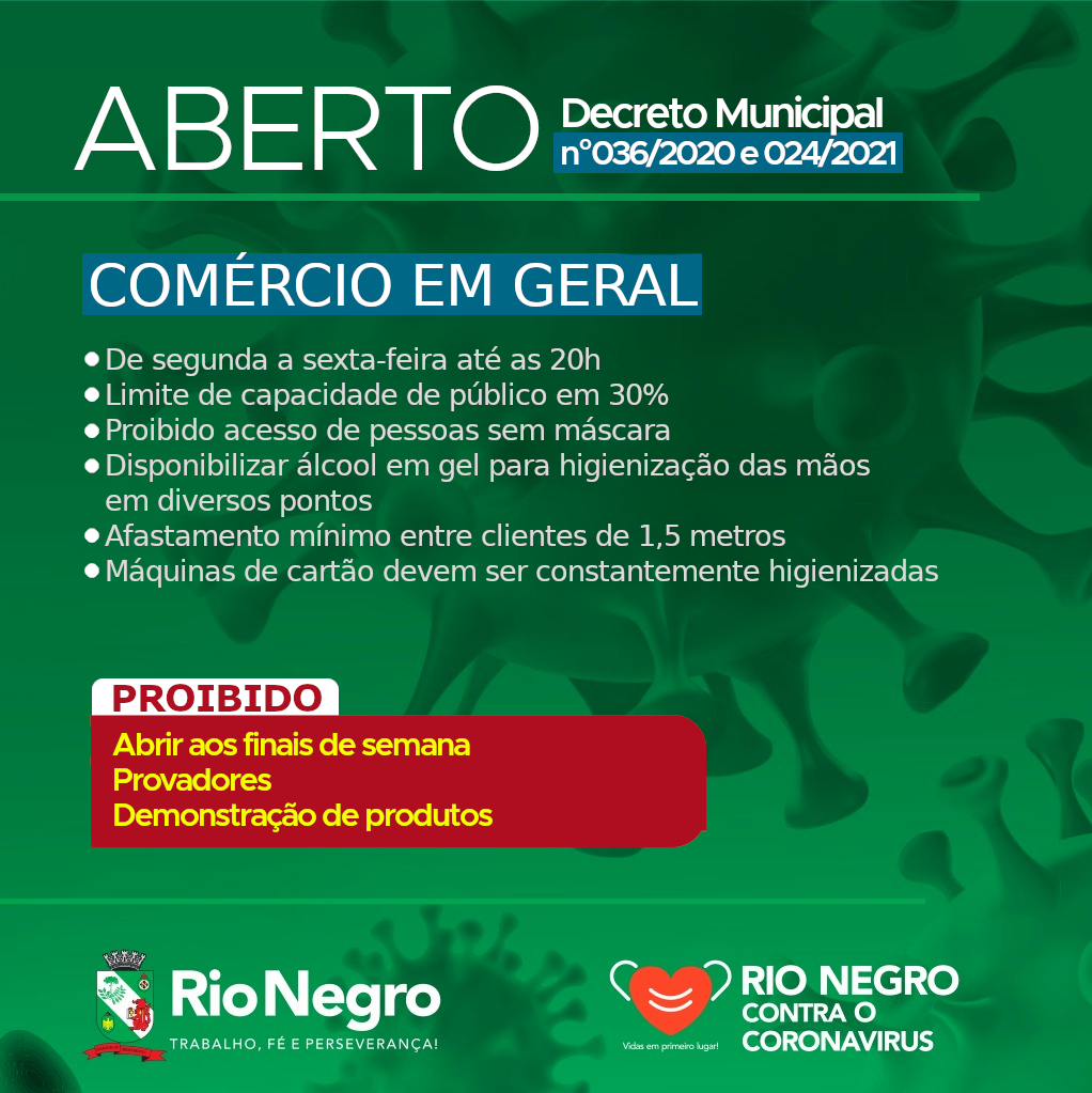 A Prefeitura Municipal de Rio Negro está aberta ao diálogo com os diversos setores da economia a fim de minimizar os impactos causados pelas medidas. Neste momento em que vivenciamos um cenário epidemiológico bastante grave, contamos com a conscientização de todos para que não haja aglomerações: evite sair de casa, não faça visitas ou reuniões, busque horários alternativos para fazer suas compras, use corretamente a máscara, faça a higienização frequente das mãos, respeite o distanciamento em filas e espaços coletivos. Proteja a vida.