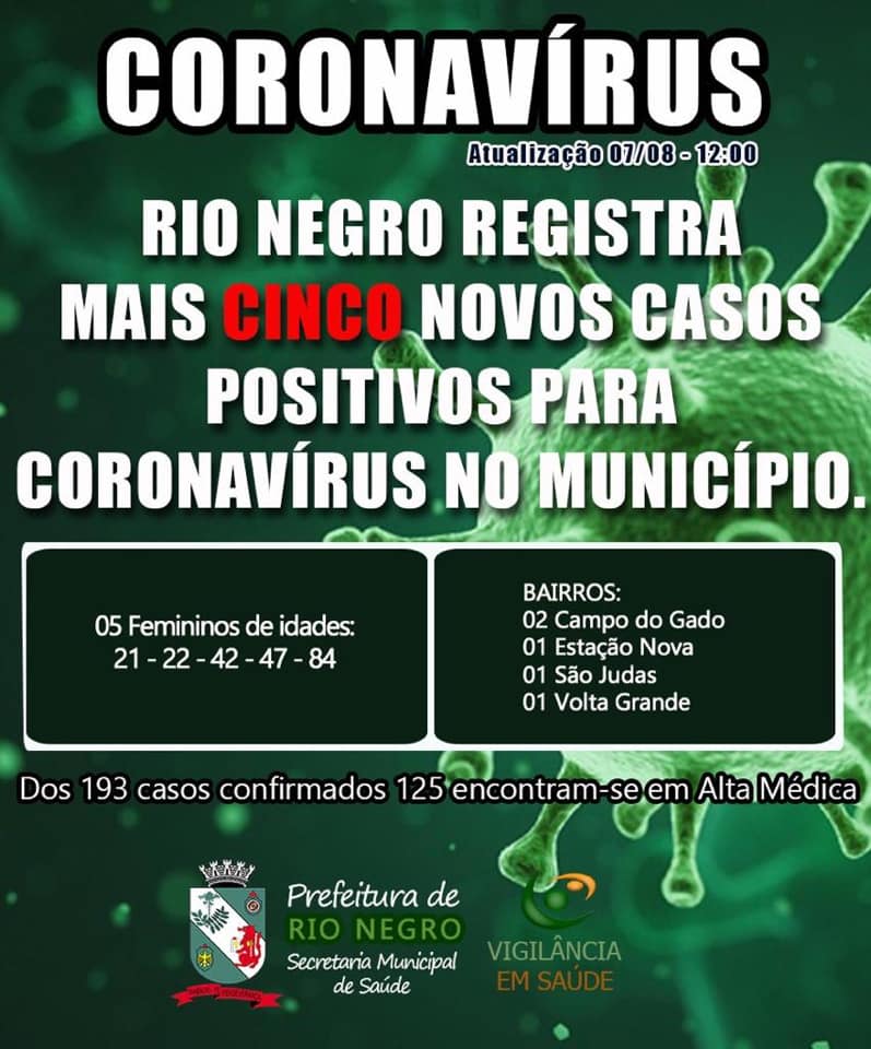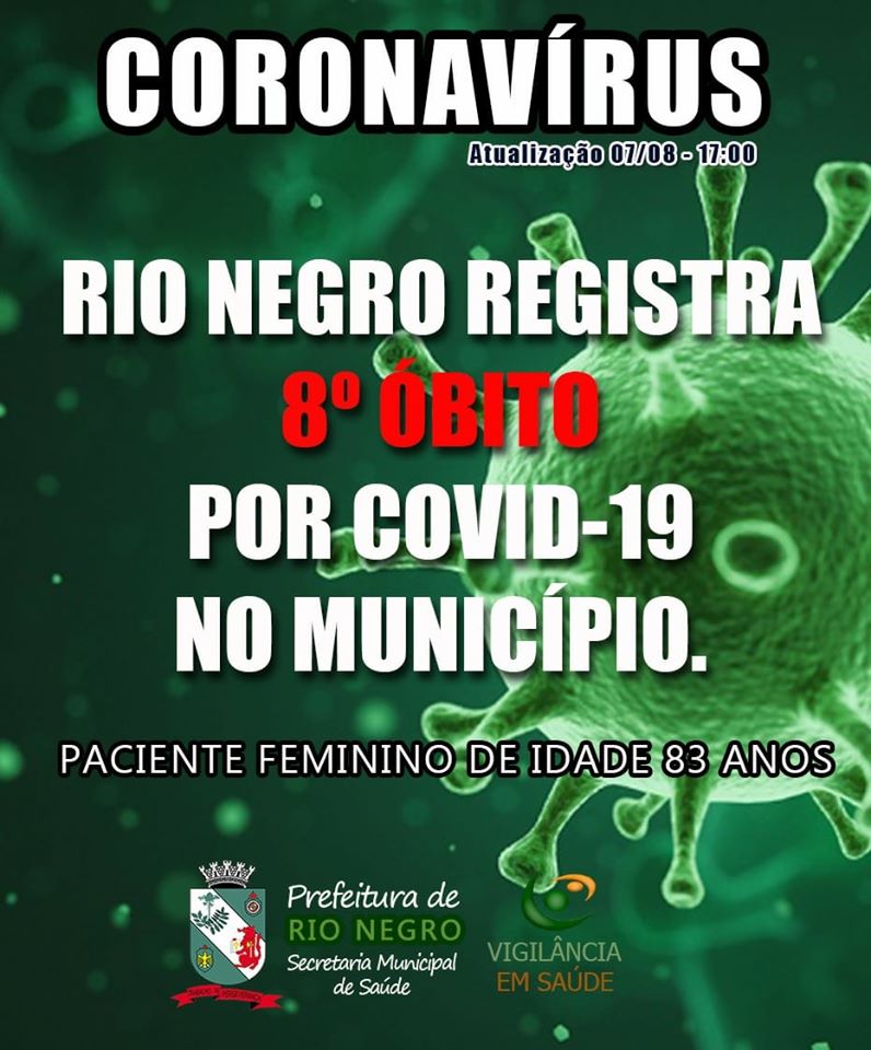 Rio Negro registrou nesta sexta-feira o oitavo óbito por Covid-19. Trata-se de uma mulher de 83 anos de idade.