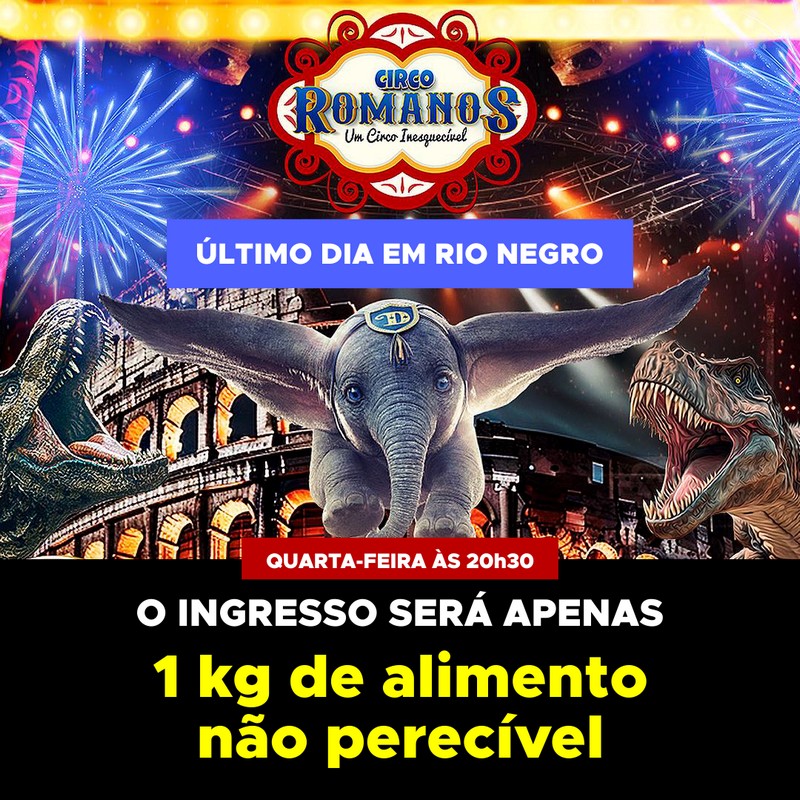 A #solidariedade faz parte da essência da famÃlia do Circo Romanos. 🙏🎪 Venha se divertir e colaborar com as famÃlias de Rio Negro atingidas pelas enchentes. Nesta quarta-feira o ingresso para o Circo Romanos será apenas 1 kg de alimento não perecÃvel. O espetáculo será à s 20h30. Será o último dia em Rio Negro! O circo está na Rua Severo de Almeida, perto da rodoviária.