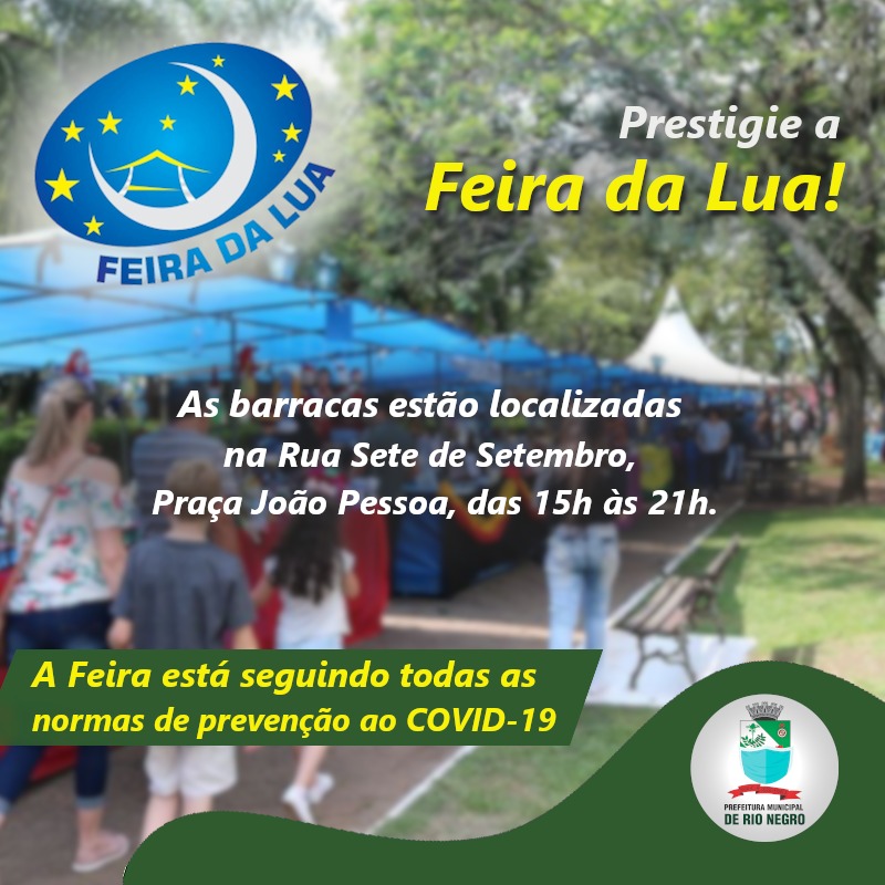Nesta quarta-feira terá Feira da Lua em Rio Negro. Aproveite para levar para casa as delícias da Feira da Lua. Ocorre todas as quartas-feiras, das 15h às 21h, na Rua Sete de Setembro, ao lado da Praça João Pessoa.