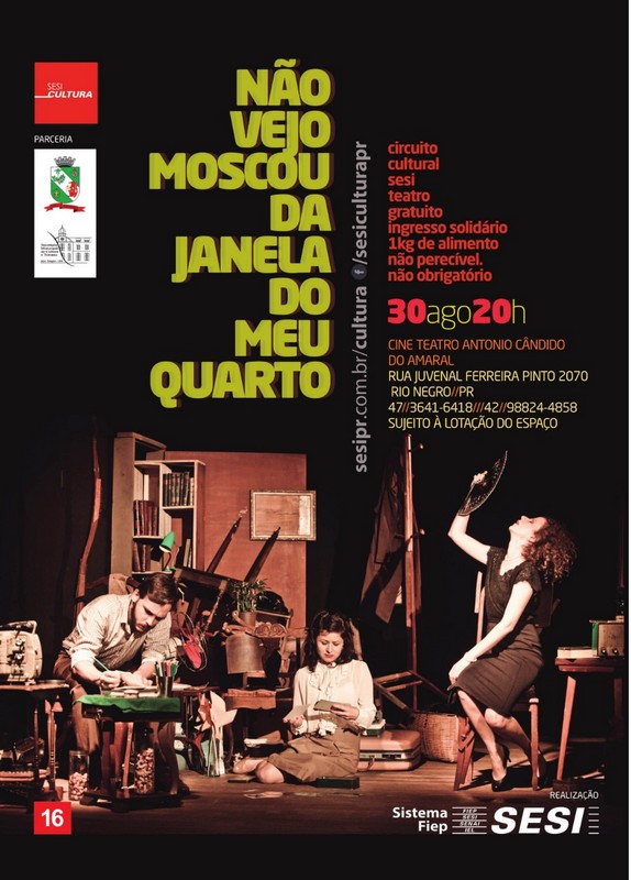 Nesta sexta-feira, 30 de agosto, à s 20h, o Cine Teatro Antônio Cândido do Amaral (popular Cine Seminário) recebe o Espetáculo “Não Vejo Moscou da Janela do Meu Quarto”. A entrada é gratuita. O espetáculo é promovido pelo Circuito Sesi Cultura em parceria com a Prefeitura de Rio Negro. A classificação Indicativa do espetáculo é 16 anos.