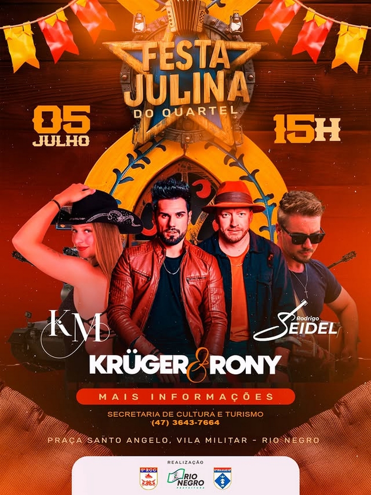 A Festa Julina do Quartel será realizada neste sábado em Rio Negro. A programação voltada para o entretenimento e lazer das famÃlias terá inÃcio à s 15h na Praça Santo Ângelo, próximo ao Ginásio de Esportes José Müller na Vila Militar.