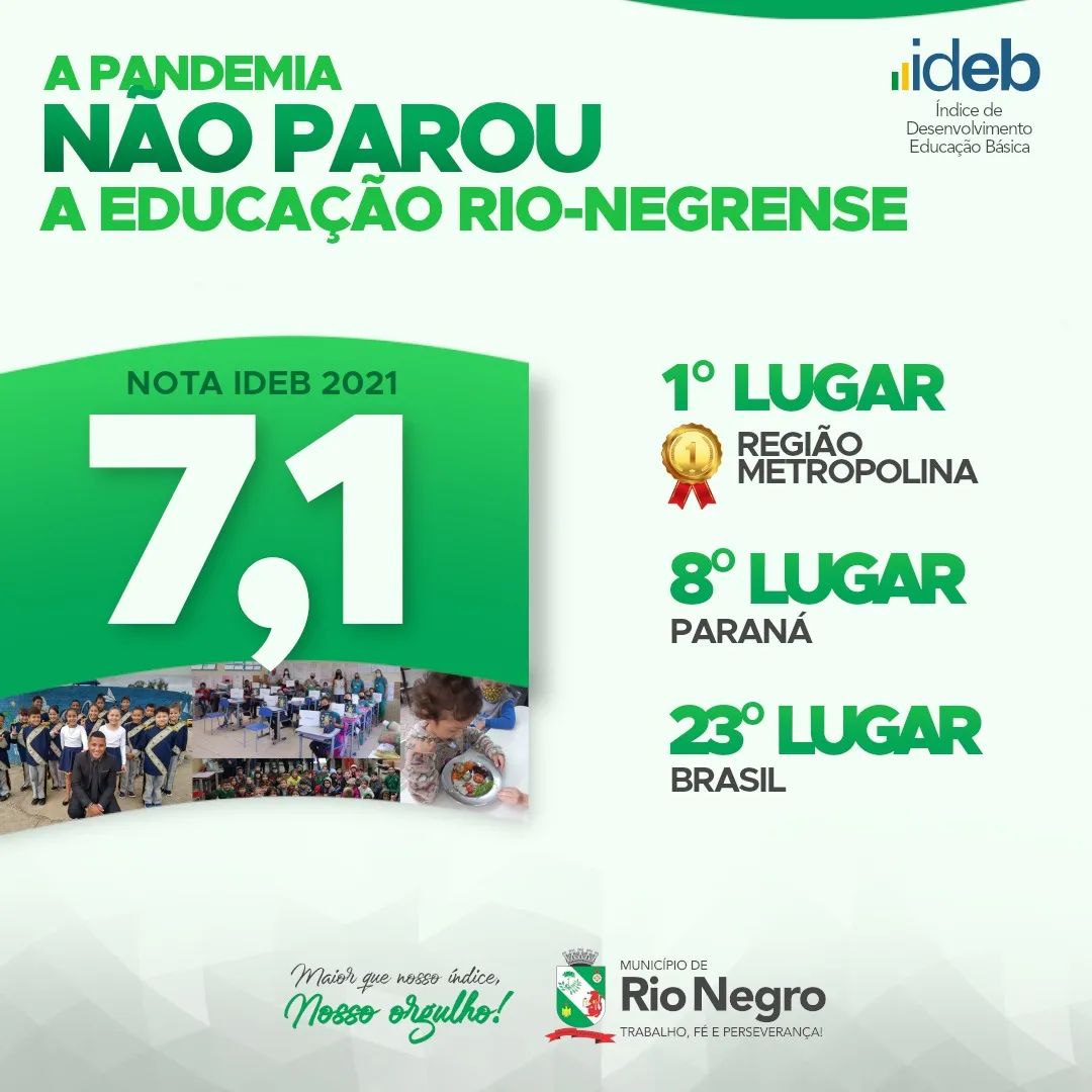 O município de Rio Negro, mantendo a tradição de sempre obter uma boa colocação no Ideb, referente ao ano de 2021 manteve a primeira colocação entre os 29 municípios da Região Metropolitana, incluindo a capital Curitiba.