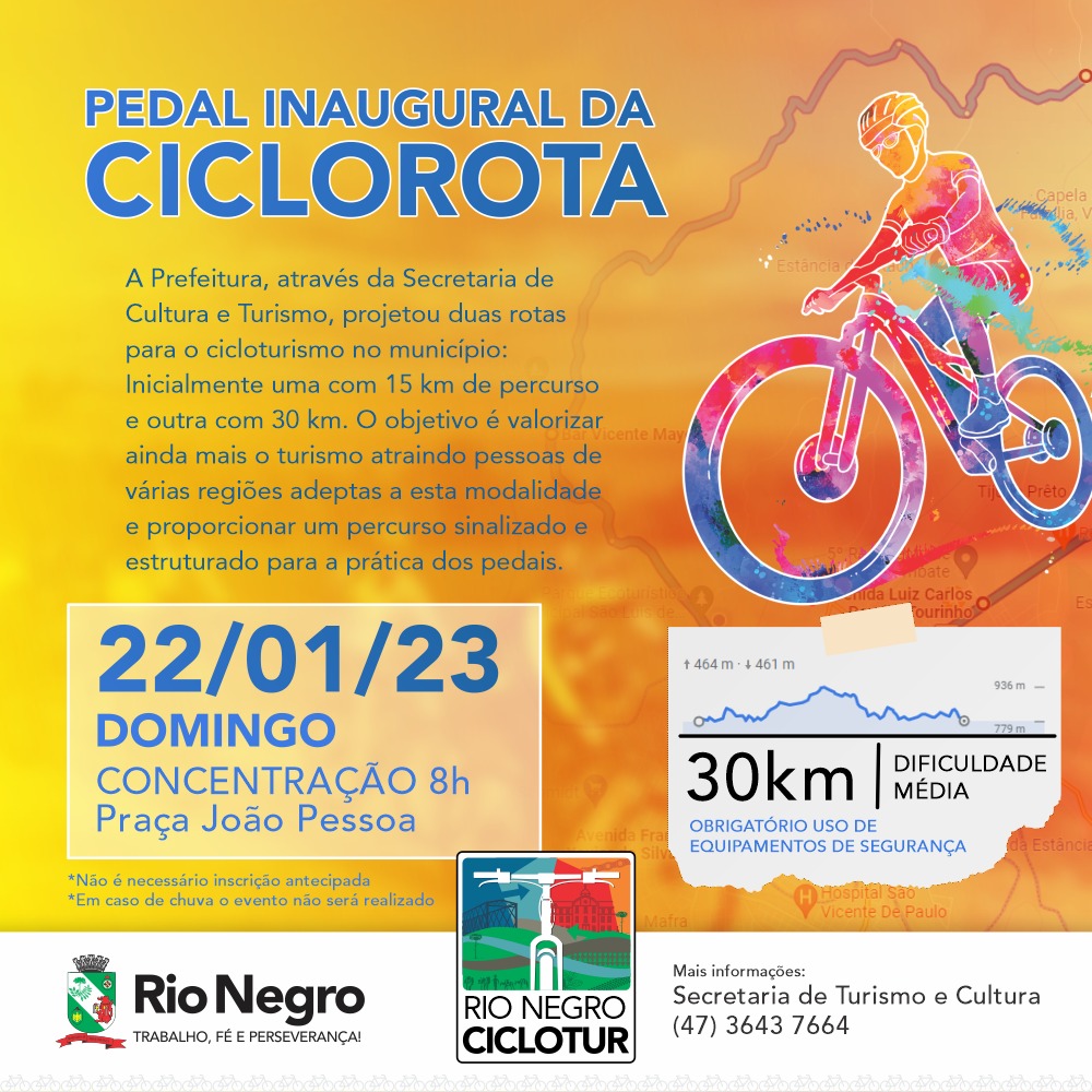 No próximo domingo, dia 22, será realizado o pedal inaugural da nova ciclorrota através do projeto Rio Negro Ciclotur. O evento tem como finalidade iniciar a divulgação das rotas e familiarizar os ciclistas com as atividades. A concentração será às 8h na Praça João Pessoa. Não é necessário realizar inscrição de forma antecipada. Em caso de chuva o evento não será realizado.